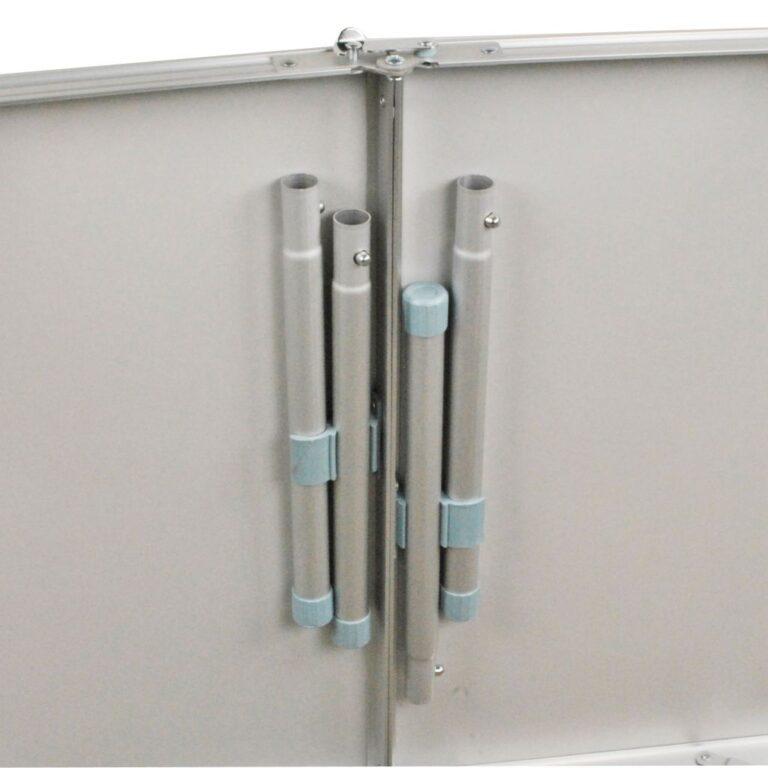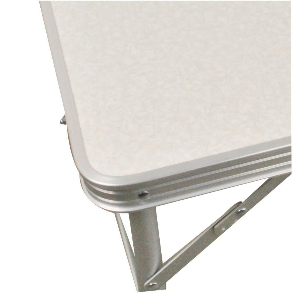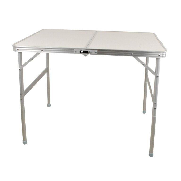 Lehký skládací stůl pro 2 až 4 lidi s laminátovou deskou odolnou vůči poškrábání a stabilní hliníkovou konstrukcí. Deska stolu je půlená a je vybavena integrovanou rukojetí, což usnadňuje přenášení.