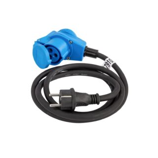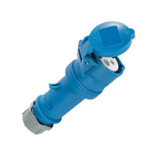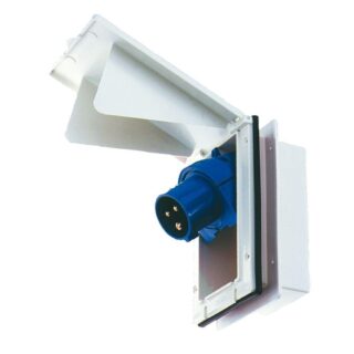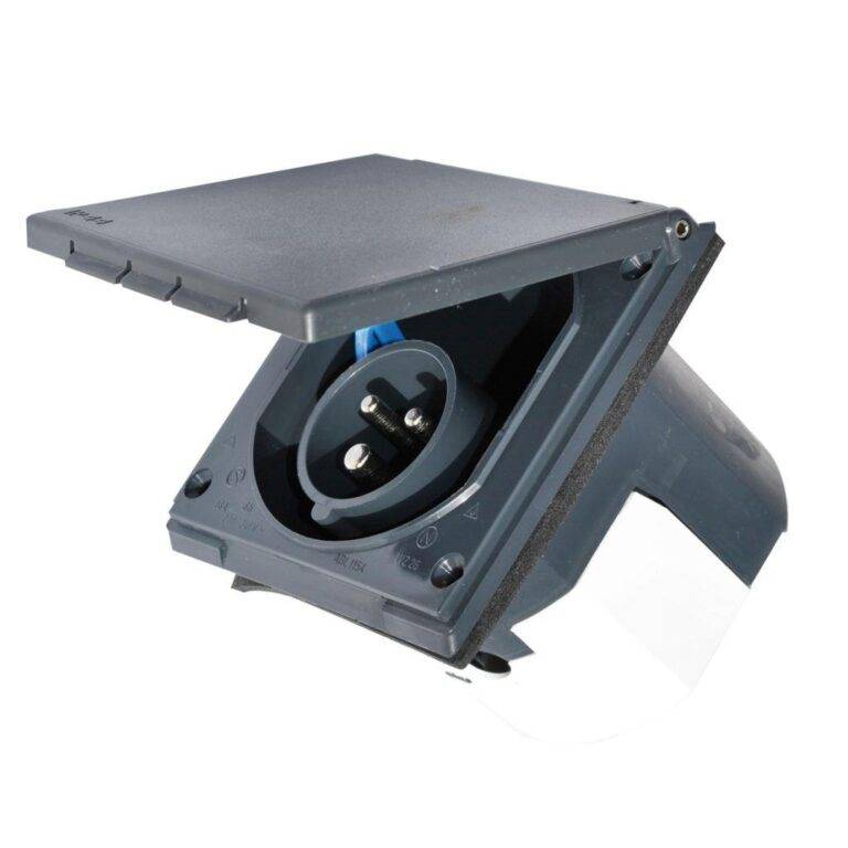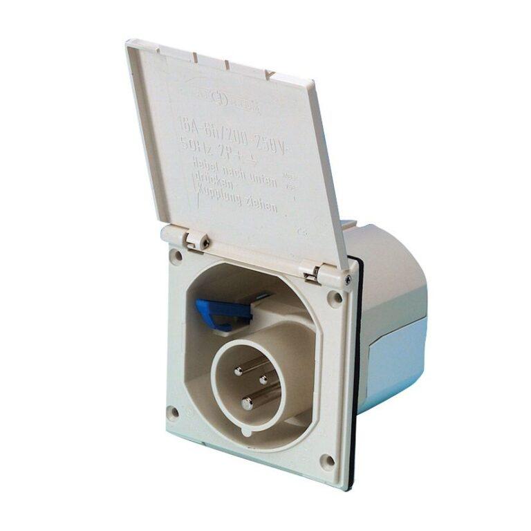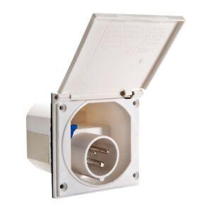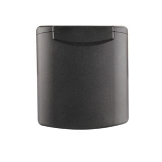 Venkovní voděodolná CEE zásuvka v malém provedení s víkem na pantech.