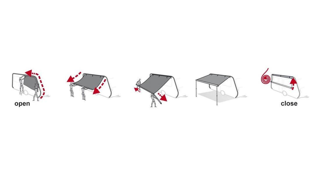 Markýza je lehká, kompaktní a jednoduchá. Rozpěrné tyče a stojany jsou součástí tubusu, na kterém je namotané plátno markýzy.