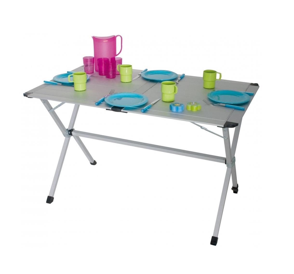 Kempingový stůl St.Pierre – hliníkový skládací stůl je dodáván včetně skladovacího obalu. Svrchní deska je voděodolná a tepluvzdorná. Jednu nohu lze prodlužovat, stůl se tak nehýbe ani při menších nerovnostech terénu. Svrchní deska je voděodolná, složená z hliníkových lamel. K dispozici je ve třech velikostech: S, M a L.