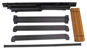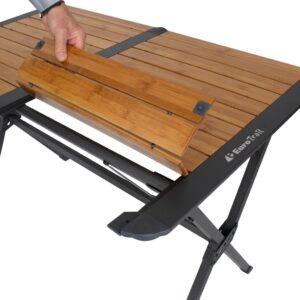 Elegantní stůl s hliníkovou konstrukcí a bambusovou deskou. Robustní konstrukce je vybavena stabilizační tyčí mezi nohami stolu, která zajišťuje mnohem větší stabilitu. Deska je vyrobena z voděodolného bambusového materiálu. Stůl včetně vrchní desky lze složit do velmi malých rozměrů, aby v karavanu ušetřil co nejméně místa. Výškově nastavitelná noha stolu pro nerovný povrch. Součástí dodávky je přepravní taška.
