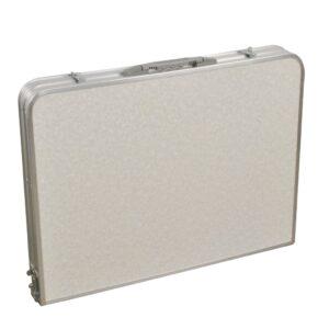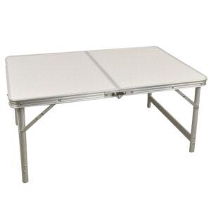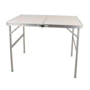 Lehký skládací stůl pro 2 až 4 lidi s laminátovou deskou odolnou vůči poškrábání a stabilní hliníkovou konstrukcí. Deska stolu je půlená a je vybavena integrovanou rukojetí, což usnadňuje přenášení.