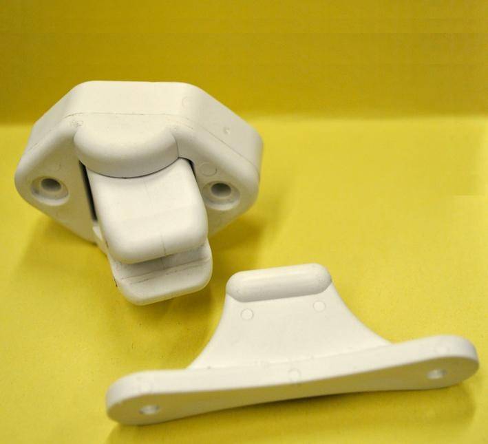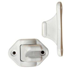Tato aretace, dveřní zarážka pro dveře karavanů se díky pohyblivému spodnímu dílu přizpůsobí každému typu dveří. Rozestup mezi otvory pro uchycení do zdi je 30 mm a mezi otvory pro uchycení na dveře je 45 mm.