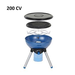 - Party Grill 200 CV – gril s piezo zapalováním a Easy Clip systémem napojování kartuší CV 300+ a CV 470+. Balení obsahuje stojan, rošt, a víko.