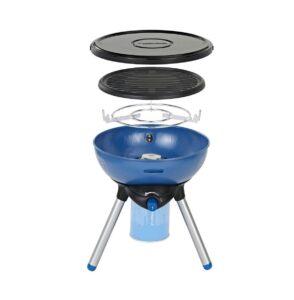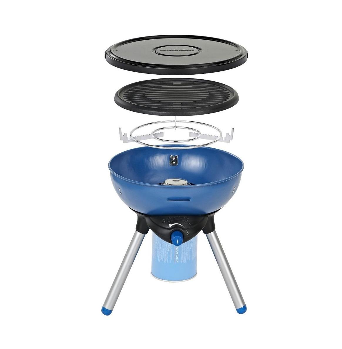 Multifunkční vařič Campingaz může být během chvilky přestaven na gril. Všechny součástky Party Grillu slouží jako víceúčelová alternativa k tradičním grilům. Snadno se čistí a přenáší. Grily jsou dostupné ve čtyřech různých variantách s odlišnou výbavou a napojením buď na kartuše Campingaz nebo na běžné plynové lahve. Podnos pod grilem lze využít k uložení nádobí a poskytuje větší stabilitu. Povrch grilu s nepřilnavým povrchem. Přívod tepla je nastavitelný pomocí otočného knoflíku. Nohy můžete snadno odnímat a uložit do grilu pro přepravu nebo skladování. Balení obsahuje podpěru pánve, grilovací mřížku a víko.