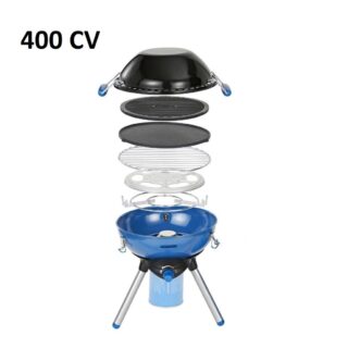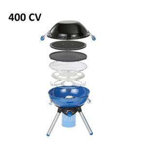 - Party Grill 400 CV – gril s piezo zapalováním a připojením na kartuši. Balení obsahuje víko s možností Wok, grilovací desku, grilovací mřížku a přepravní tašku.