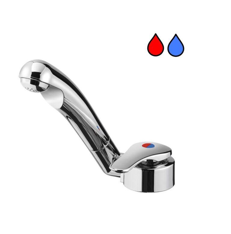 Směšovací, páková vodovodní baterie se spínačem (IP 67), pochromovaná s keramickou kartuší. Se sklopním ramenem.