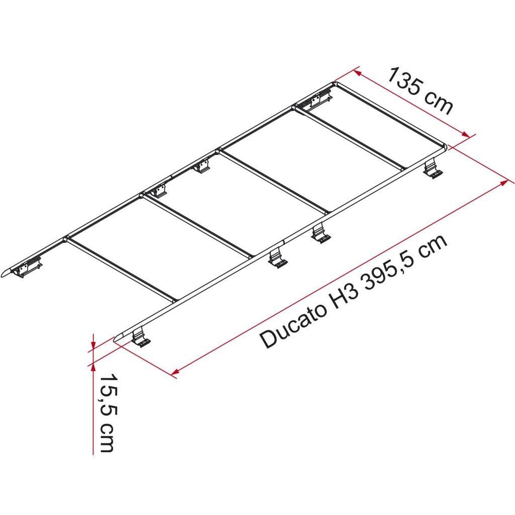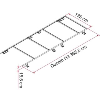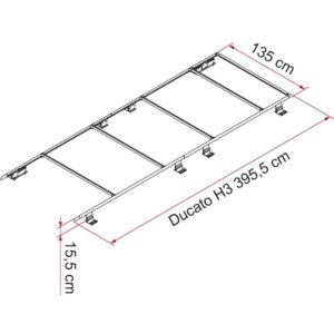 Střešní nosič vhodný pro Fiat Ducato H3 o délce do 6,36 m vyrobené od r. 2006 do 2014. Nosič se instaluje přímo na originální předpřipravané body ve střeše dodávky. K nosiči je možné nainstalovat markýzu F65, a to na pravou stranu vozidla (ve směru jízdy) za pomoci přiložených adaptérů. V případě instalace delší a těžší verze markýzy doporučujeme přikoupit extra adaptéry pro zvýšení nosnosti.